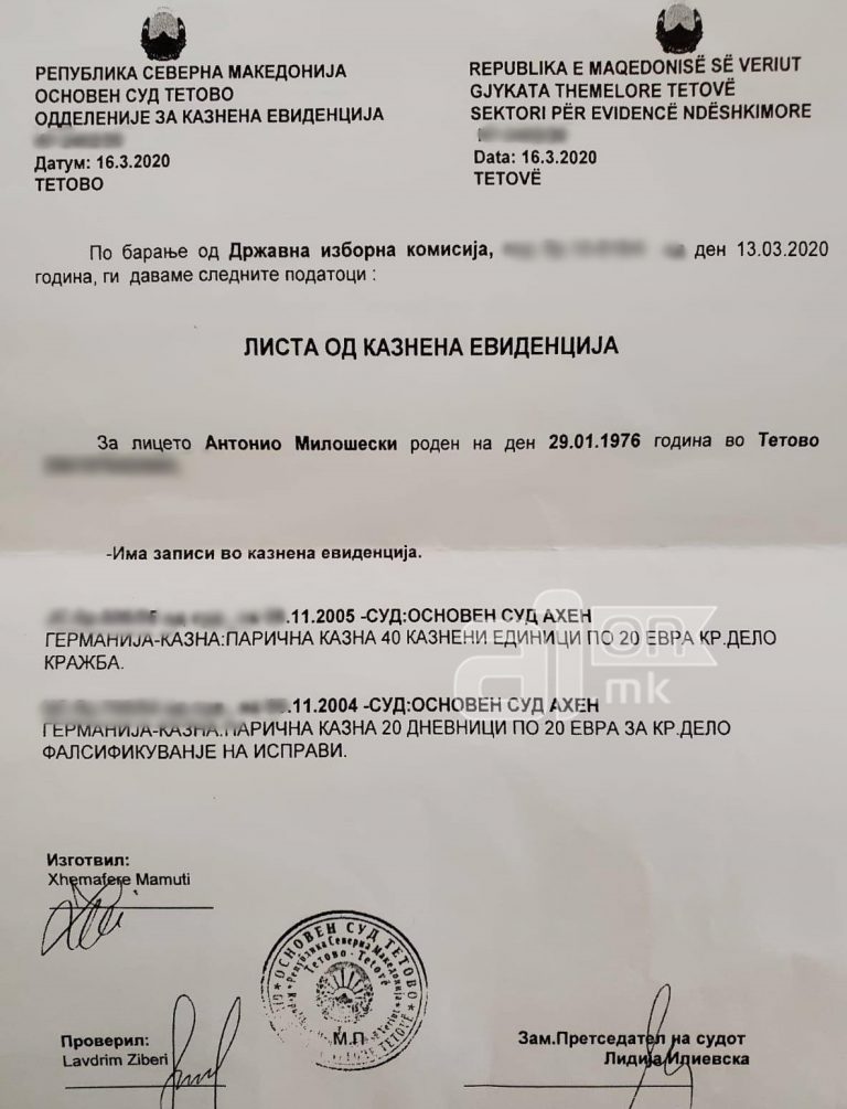 Запис од казнена евиденција одновно го побива тврдењето на пратеникот на ВМРО-ДПМНЕ, Антонијо Милошоски, кој велеше дека не е осудуван во Германија. Документот до кој дојде „А1он“, а е издаден од Основниот суд во Тетово по барање на Државната изборна комисија на почетокот од претходната година, покажува дека тој бил двапати осудуван. Ова е втор документ кој го демантира Милошоски, кој велеше дека не сторил кривични дела во Германија.
