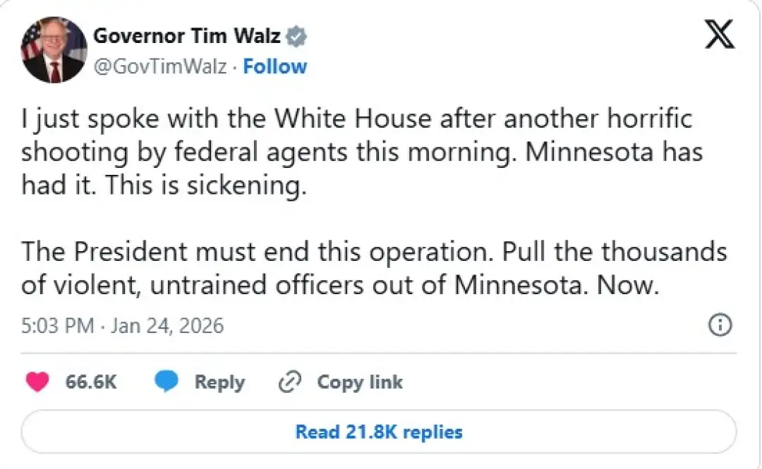 Гувернерот на Минесота, Тим Волц, се огласи на социјалните мрежи за да каже дека разговарал со Белата куќа по она што го нарече „уште едно ужасно пукање од страна на федерални агенти“.