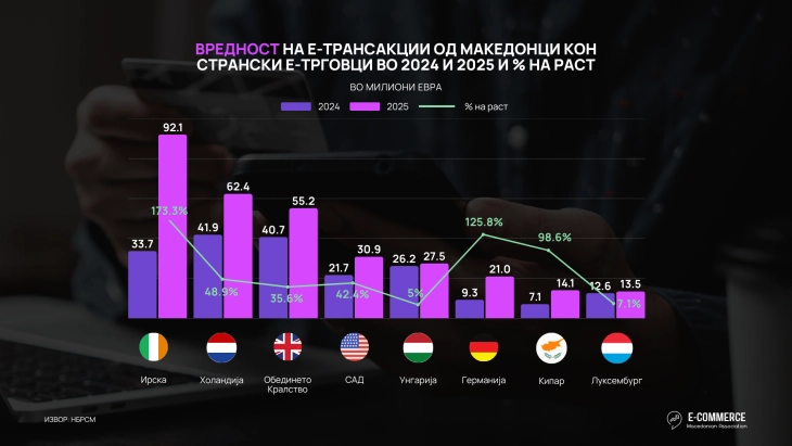 Македонците оствариле најголема вредност на е-трансакции во Ирска, во износ од 92,1 милиони евра, со пораст од 173 % во однос на минатата година, а во Холандија е остварена вредност од 62,4 милиони евра и пораст од 49 % во однос на минатата година.