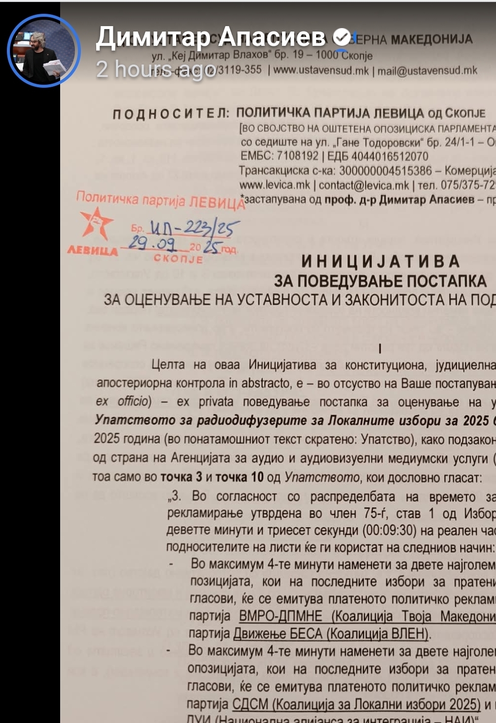 Уставен суд на Република Северна Македонија како да е паднат од Марс… Од петокот одбива да поведе постапка по СЛУЖБЕНА ДОЛЖНОСТ (ex officio) против дискриминаторското Упатство на АВМУ со кое и се забранува на една политичка партија да се рекламира на медиумите – иако политичкиот плурализам и слободните и фер избори се стипулирани како ТЕМЕЛНИ ВРЕДНОСТИ на нашиот уставен поредок“ пишува на Фејсбук лидерот на Левица – Димитар Апасиев.