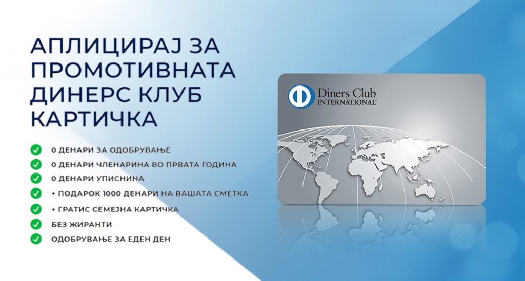 Празнична понуда на Динерс Клуб! Аплицирајте за картичка најдоцна до 31-ви декември и добијте подарок 1000 денари на Вашата Динерс Клуб сметка и гратис семејна картичка. Картичката ја добивате за еден ден, без трошоци за одобрување, без жиранти и уписнина и 0 денари чланарина првата година!