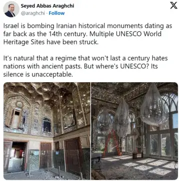 Шефот на иранската дипломатија, Абас Арагчи, денеска изјави дека Израел бомбардирал ирански историски споменици кои датираат од 14 век, погодувајќи неколку локации под заштита на УНЕСКО.
