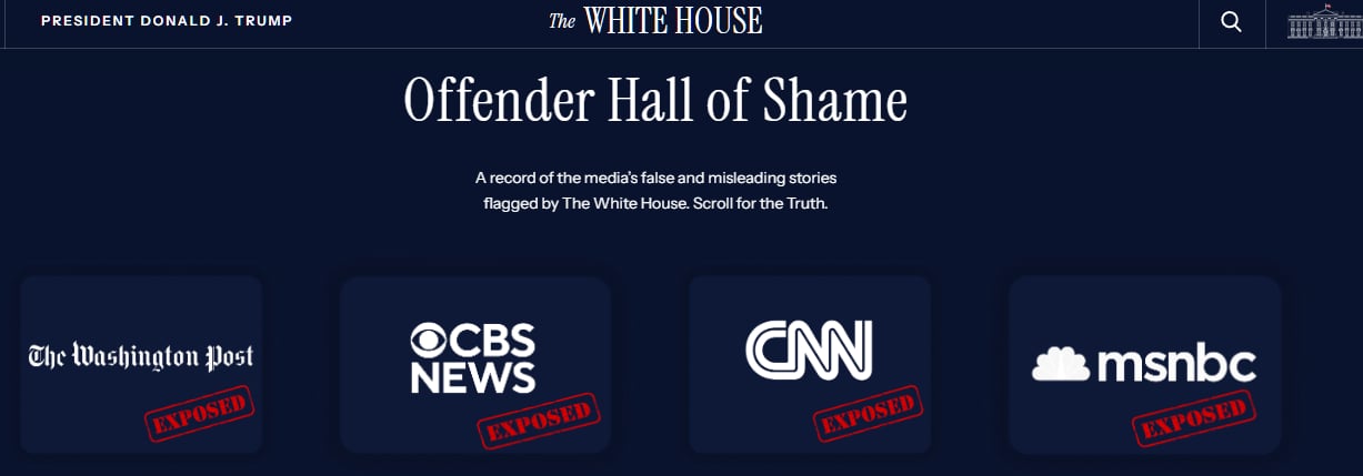 Белата куќа објави дека покренала медиумска „Куќа на срамот“ на веб-страницата на американската влада, каде се коментира за известувањето на медиумите за работата на владата и претседателот на САД Доналд Трамп.