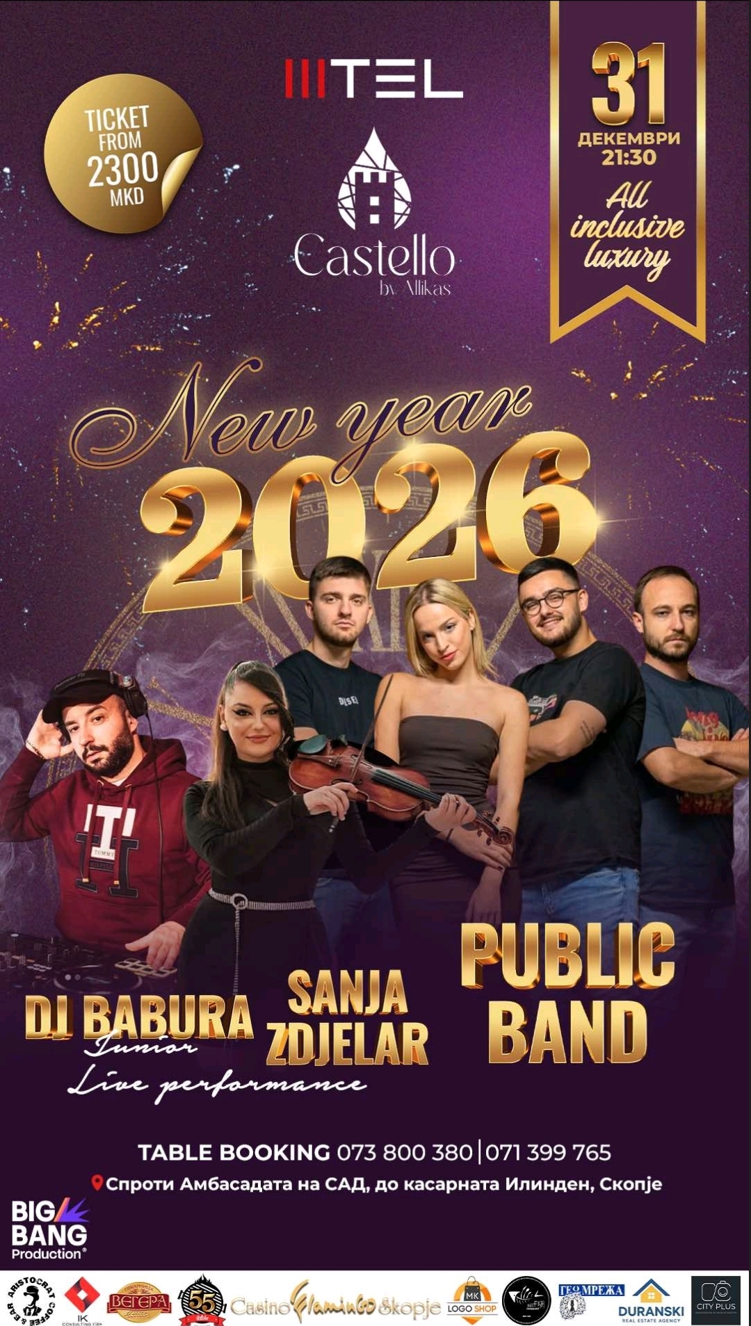 Вечерта со почеток од 21:30 дочекајте ја новата година со Life Performance на диџеј Бабура џуниор, виолинистката Сања Здјелар и незаменливите Public Band
