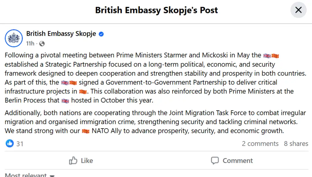 -По клучната средба меѓу премиерите Стармер и Мицкоски во мај, Велика Британија и Северна Македонија воспоставија Стратешко партнерство фокусирано на долгорочна политичка, економска и безбедносна рамка дизајнирана да ја продлабочи соработката и да ја зајакне стабилноста и просперитетот во двете земји. Како дел од ова, двете земји потпишаа партнерство Влада со Влада за реализација на критични инфраструктурни проекти во земјава. Оваа соработка беше зајакната и од двајцата премиери за време на средбата во рамки на Берлинскиот процес што се одржа во Британија во октомври оваа година.  Дополнително, двете земји соработуваат преку Заедничката работна група за миграција за борба против нерегуларната миграција и организираниот имиграциски криминал, зајакнувајќи ја безбедноста и справувајќи се со криминалните мрежи. Ние стоиме цврсто со нашиот македонски сојузник во НАТО во унапредувањето на просперитетот, безбедноста и економскиот раст, стои во објвата на фејсбук профилот на Британската амбасада.