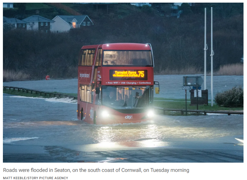 „Дури и ако не достигне количина за еден месец, таа количина дожд што паѓа за толку краток временски период ќе предизвика прекини“, рече Лиам Еслик, метеоролог од Метеоролошката служба. „Очекуваме многу прекини. Може да има прекини во железничкиот сообраќај, дури и фериботи преку каналот Бристол и затворање на мостови, бидејќи има и многу силен ветер.