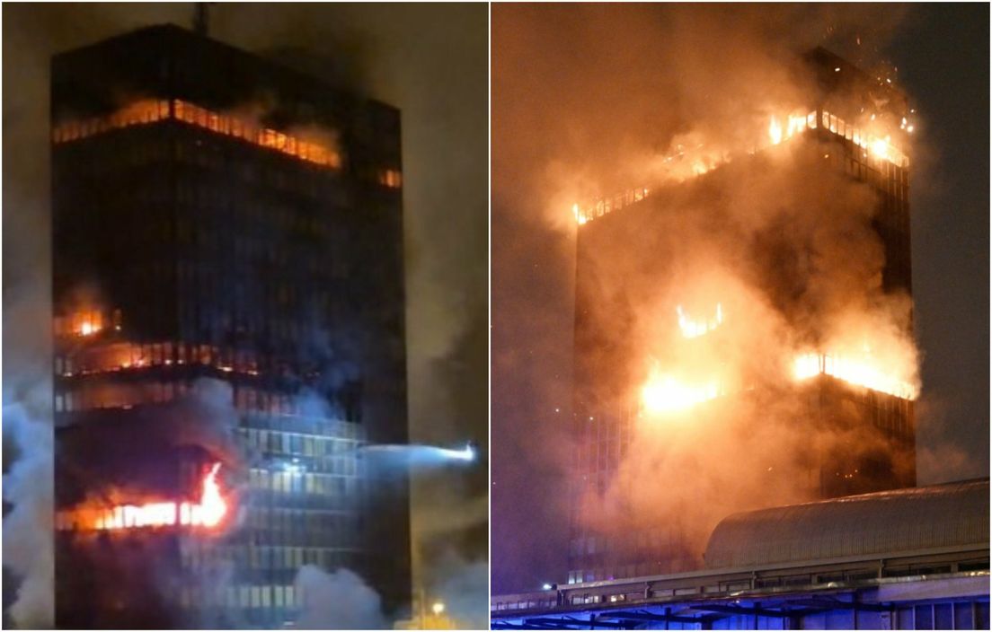 Ситуацијата била исклучително опасна, а пожарникарите го гаснеа пожарот од долу што се шири по вертикалите на зградата. Додека гореше зградата, стакло паѓаше од облакодерот.