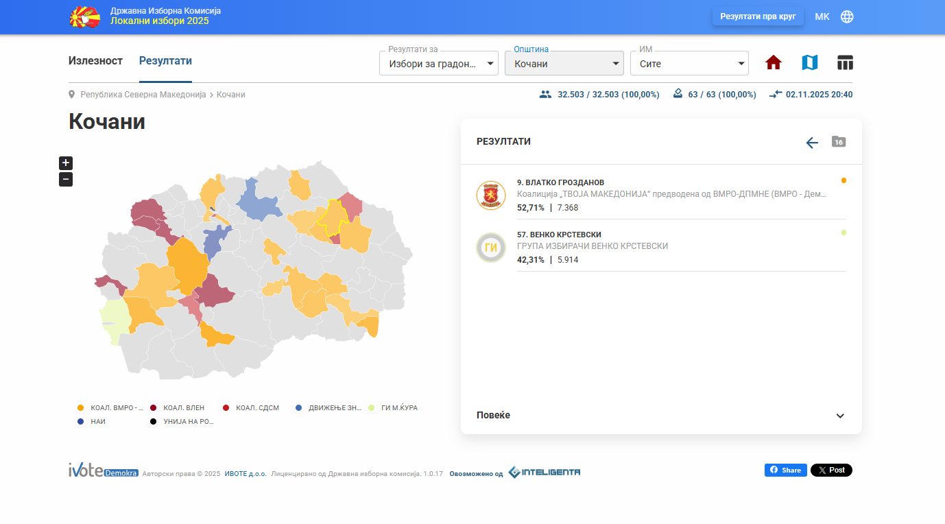 Кандидатот на коалицијата „Твоја Македонија“ предводена од ВМРО-ДПМНЕ, Влатко Грозданов, е новиот градоначалник на Општина Кочани, покажуваат конечните податоци од Државната изборна комисија (ДИК).
