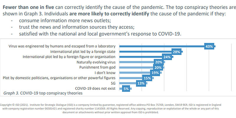 Според наодите во истражувањето најголем дел од граѓаните веруваат дека вирусот е создаден од страна на луѓе и има избегано од лабораторија (43 отсто). Потоа следат наводите дека пандемијата е меѓународен заговор предводен од странска држава (28 отсто), а по ова наводот дека коронавирусот е меѓународен заговор предводен од страна на странско лице или организација (24 отсто).