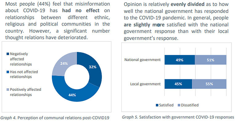 Истражувањето покажува дека повеќето граѓани, односно 44 отсто сметаат дека дезинформациите поврзани со Ковид-19 немаат ефект врз односите меѓу различни етнички, верски и политички заедници во земјата. Триесет и два отсто сметаат дека постои негативно влијание, додека 24 проценти се изјасниле дека влијанието е позитивно.