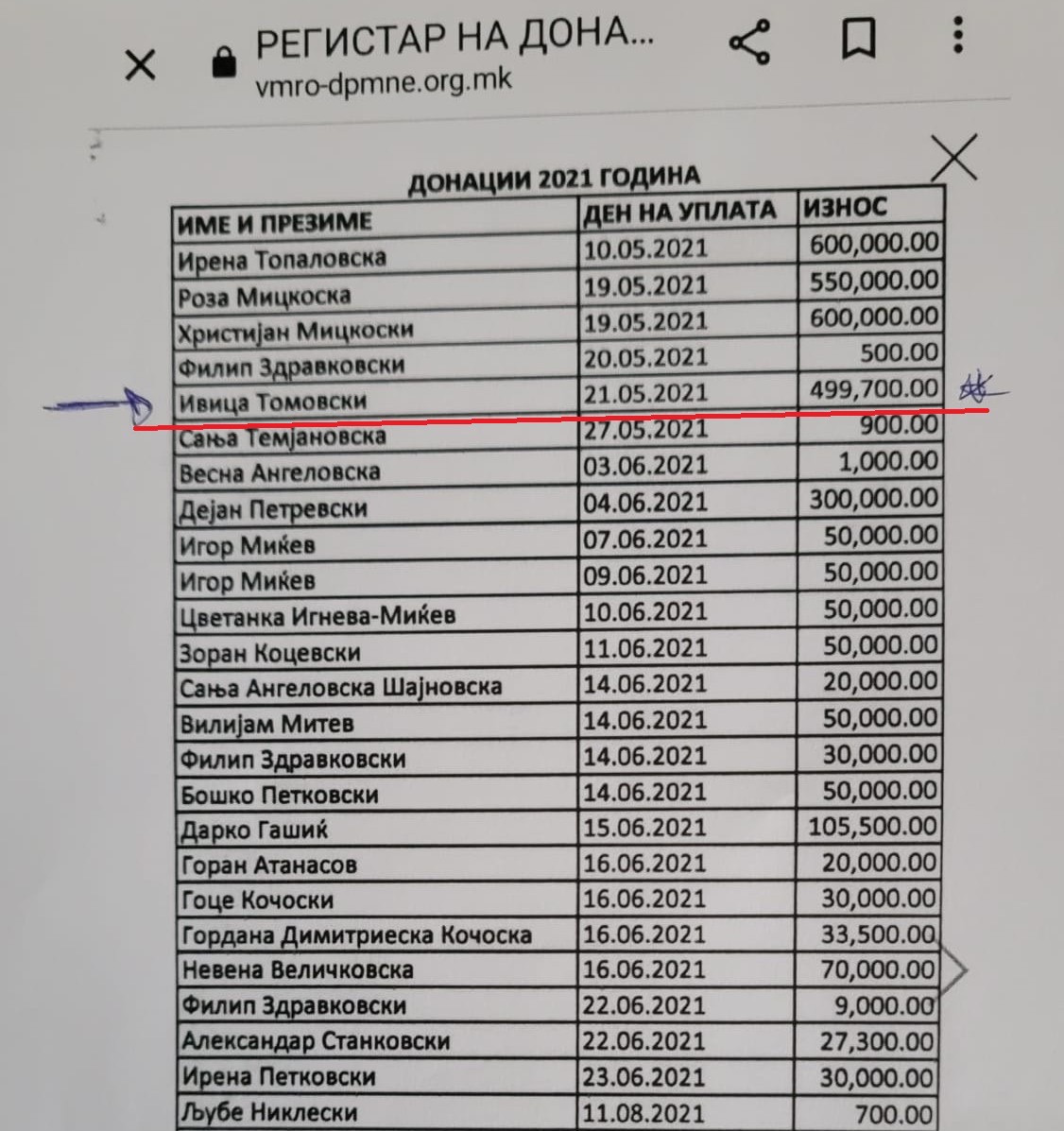 (ДОКУМЕНТИ) Кузеска: Го следиме трагот на парите: Томовски донира во ВМРО-ДПМНЕ