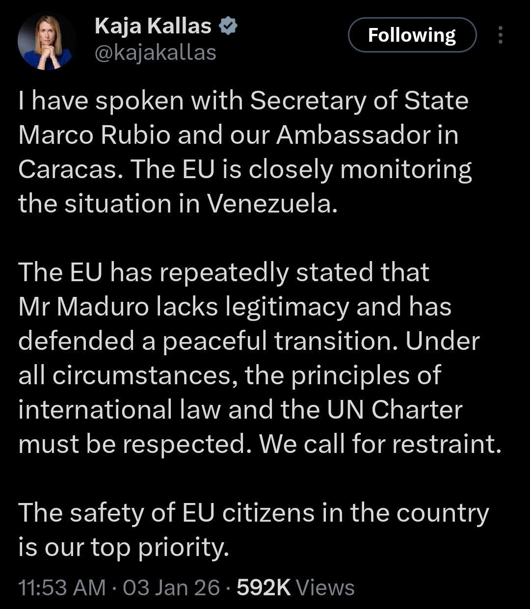 Во изјава за јавноста Калас објави дека разговарала со државниот секретар на САД Марко Рубио и со амбасадорит на унијата во Каракас.