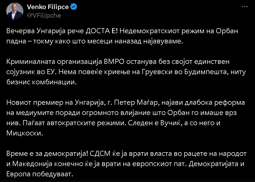 Лидерот на СДСМ, Венко Филипче на „Икс” напиша дека вечерва Унгарија кажа ДОСТА Е, падна Орбан, Европа не сака автократи!