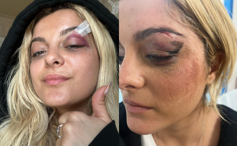 Пејачката подоцна објави фотографија на Инстаграм профилот, каде може да се забележи помодреното око и конците на раната.