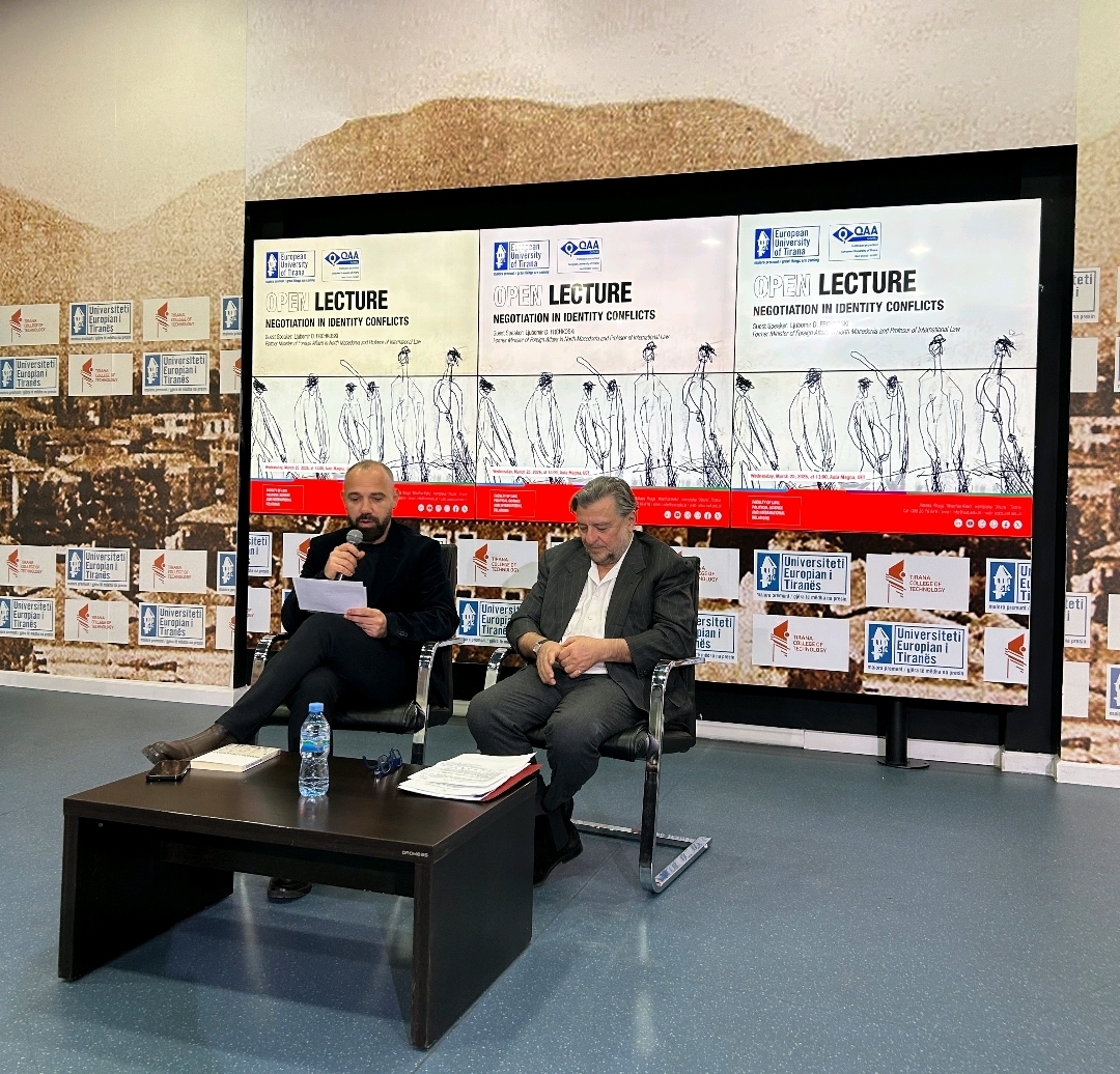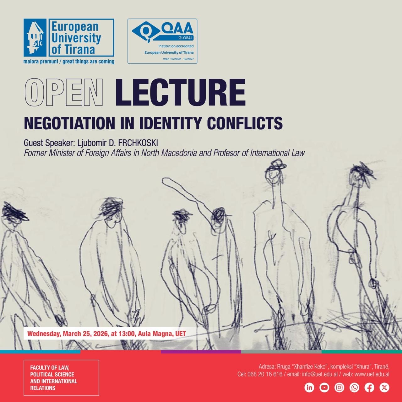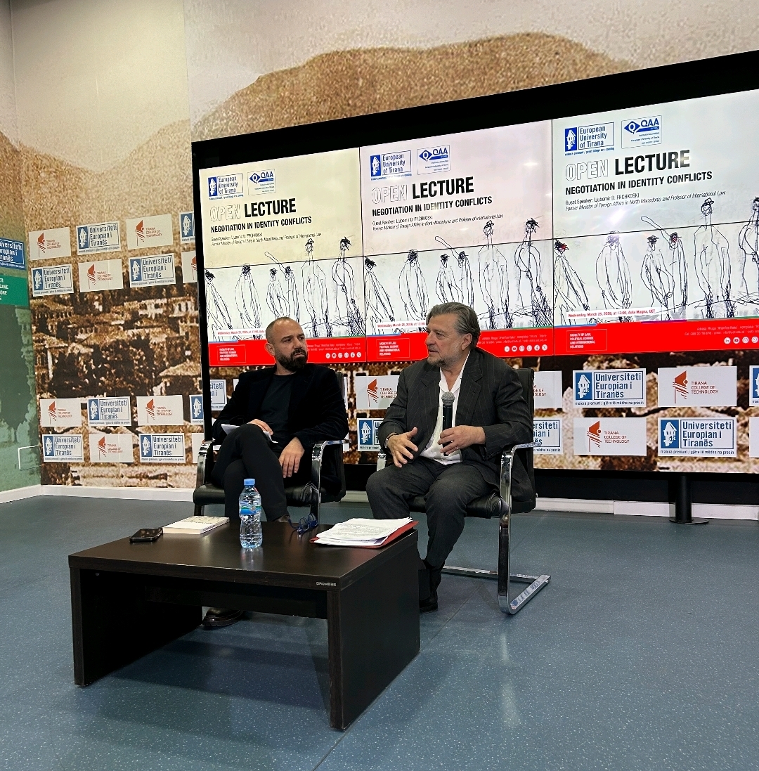 На 25 март, на Европскиот Универзитет во Тирана се одржа предавање на истакнатиот македонски професор и јавен интелектуалец, Љубомир Д. Фрчкоски, посветено на темата на идентитетските конфликти, нивната динамика и можностите за нивно надминување преку преговори и медијација.