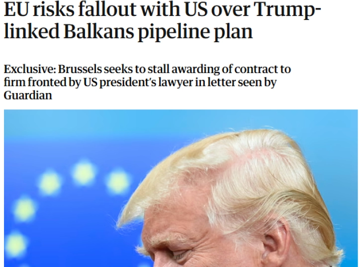 Европската Унија ризикува конфронтација со американскиот претседател Доналд Трамп откако се обиде да го одложи доделувањето на профитабилниот договор за балкански гасовод на компанија која ја застапуваат негови лични соработници, покажуваат документите до кои дошол британскиот весник „Гардијан“.