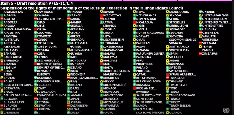Деведесет и три земји денеска гласаа за суспендирање на Русија од Советот за човекови права на ОН поради злосторствата во киевското предградие Буча и други места во Украина.