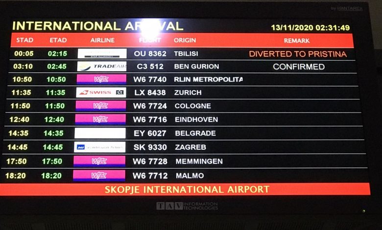 Пристигнувањето на аеродромот во Скопје беше најавено за 2:15 часот, но официјалните лица потврдија дека поради лошите временски услови, авионот од Тбилиси е пренасочен кон Приштина.
