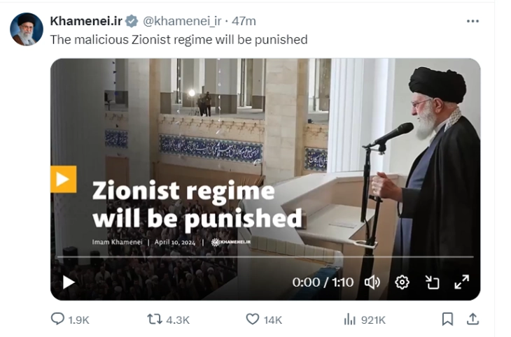 Иранскиот ајатолах Хамнеи на својот официјален профил на Х објави обраќање во врска со иранскиот напад врз Израел.