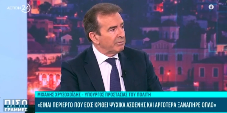 – Грција е безбедна земја, но постојат и опасни луѓе, како што беше и 89-годишникот кој не се однесуваше согласно неговата возраст. Сепак, во Грција немаме секој ден инциденти со вооружено лице кое влегува во некоја служба и пука кон вработени. Нема причина во Грција, една толку мирна и безбедна земја, сите институции да се чуваат, да има камери насекаде и приватно обезбедување, и да се прават толку големи трошоци. Грција не е таква земја, истакна Хрисохоидис.