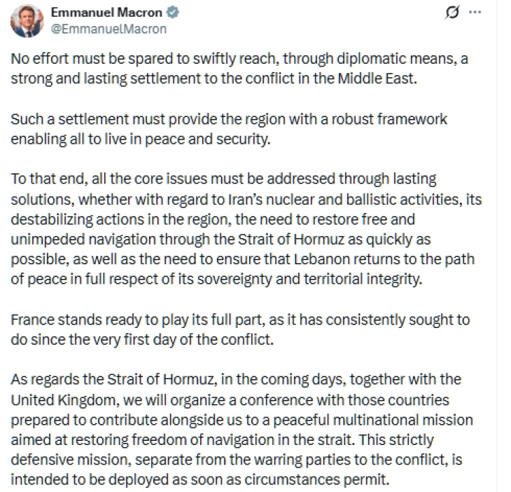 Францускиот претседател Емануел Макрон во најава на платформата X изјави дека земјата ќе организира конференција со Велика Британија и други држави за создавање мултинационална мисија за враќање на пловидбата во тој дел од светот.