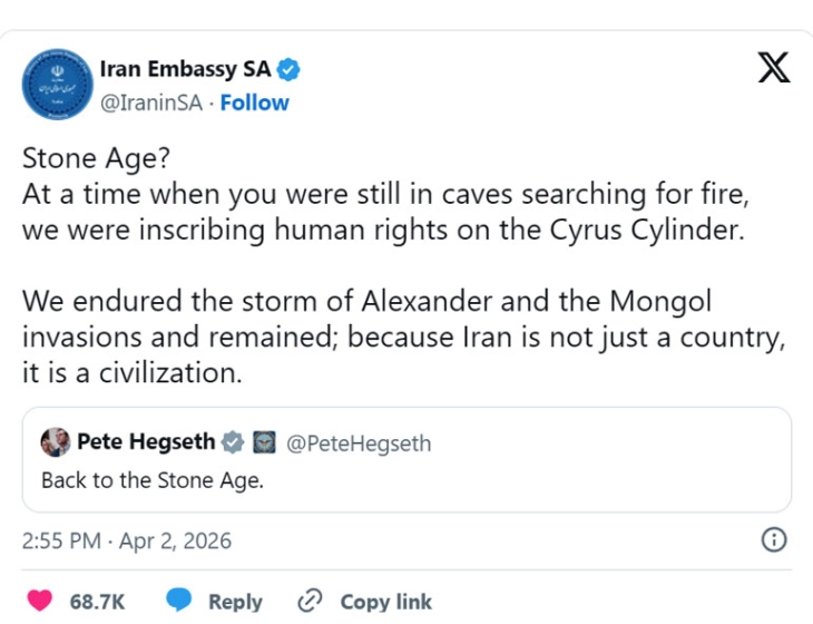 – Камено доба? Во време кога вие сè уште живеевте во пештери и го баравте огнот, ние ги впишавме човековите права на цилиндарот на Кир. Го преживеавме нападот на Александар и монголската инвазија и опстанавме, бидејќи Иран не е само земја, туку и цивилизација, објави Амбасадата на Иран на Икс.