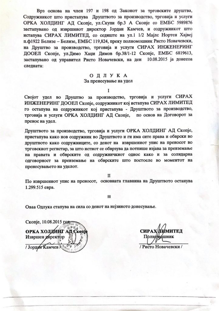 На 9 септември со седиште во стан во Кисела Вода во Скопје „Сирах лимитед“ ја формира се формира својата фирма ќерка „Сирах инженеринг“ со паричен влог од 1,7 милиони евра, на која за управител е назначен Ристо Новачевски. Веднаш потоа почнува операцијата за префрлање на парите од Белизе во Македонија.