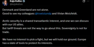 „Безбедноста на Арктикот е заеднички трансатлантски интерес и можеме да разговараме за тоа со нашите американски сојузници. Сепак, заканите со царини не се начин да се направи тоа“, рече Калас во објава на мрежата X по состанокот во Брисел со данскиот министер за одбрана Троелс Лунд Поулсен и министерката за надворешни работи на Гренланд, Вивијан Мотсфелд.
