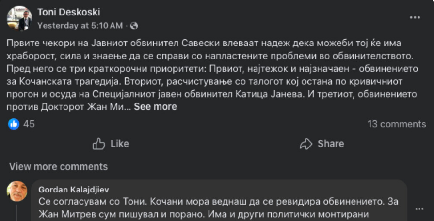 „Се согласувам со Тони. Кочани мора веднаш да се ревидира обвинението. За Жан Митрев сум пишувал и порано. Има и други политички монтирани процеси. На пример, Скопје 2014; Артан Груби и сл.“, напиша Калајџиев.