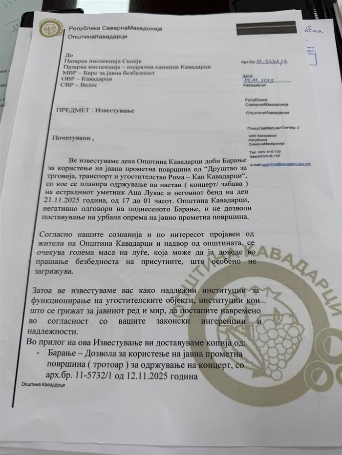 Според документацијата до која дојде Канал 5 јасно е дека кафетеријата „Рома“ немала никаква дозвола за организирање на настапот на српскиот пејач Аца Лукас.
