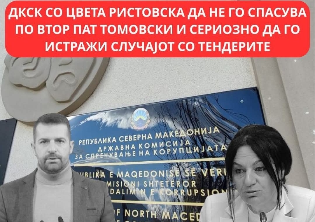 Левица: ДКСК СО ЦВЕТА РИСТОВСКА ДА НЕ ГО СПАСУВА ТОМОВСКИ ПО ВТОР ПАТ И СЕРИОЗНО ДА ГО ИСТРАЖИ СЛУЧАЈОТ СО ТЕНДЕРИТЕ