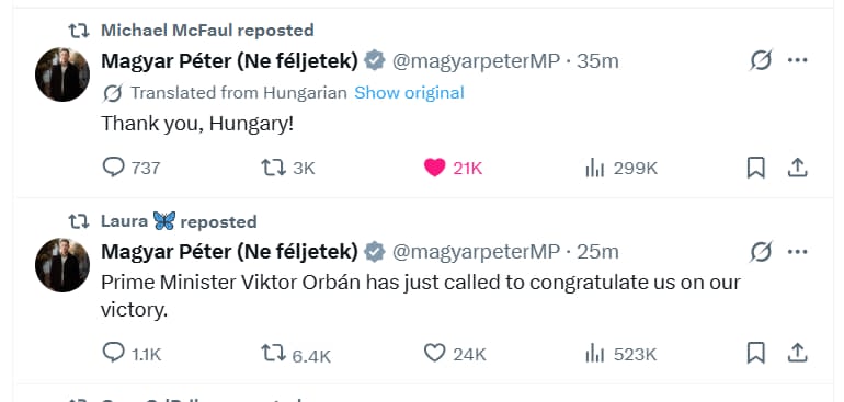 Порано, Петер Маѓар, лидерот на Тиса, рече дека Орбан им се јавил за да им ја честита победата.