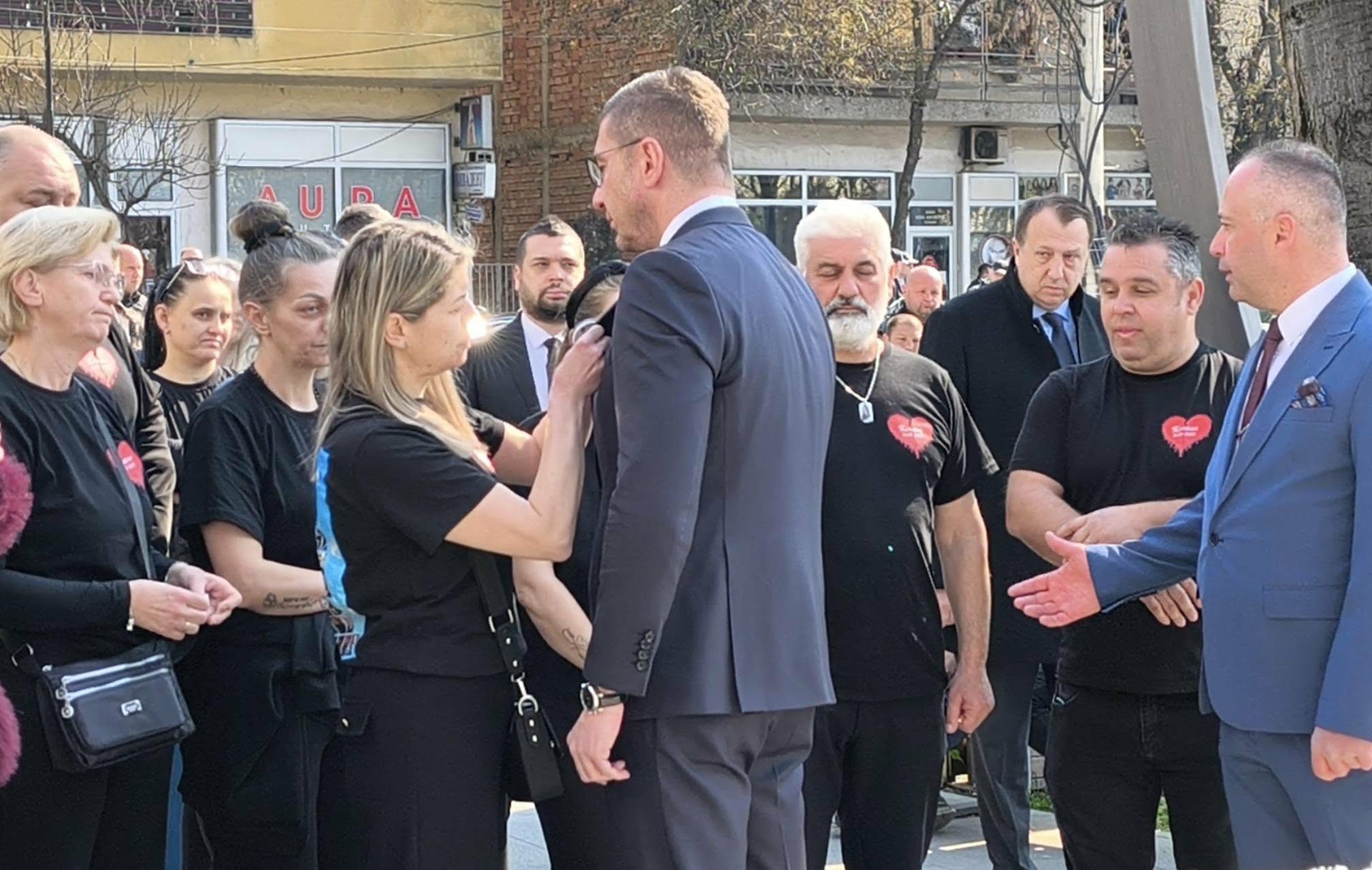 Мајка на една од жртвите во Кочани му стави на Мицкоски беџ со скршено срце и датумот 16.03.2025