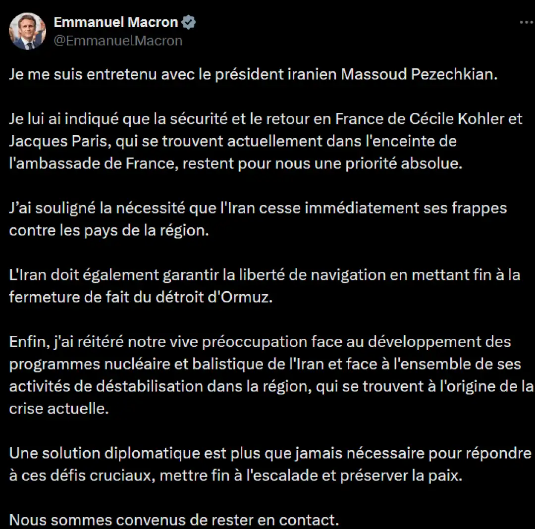 Францускиот претседател Емануел Макрон вечерва објави дека телефонски разговарал со својот ирански колега, Масуд Пезешкијан, и го повикал Иран да ги запре нападите врз други земји во регионот и да го отвори Ормускиот теснец.