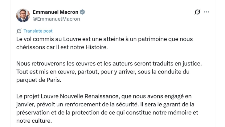 Францускиот претседател Емануел Макрон изрази увереност дека експонатите украдени од Лувр ќе бидат пронајдени и оти сторителите ќе бидат изведени пред лицето на правдата.
