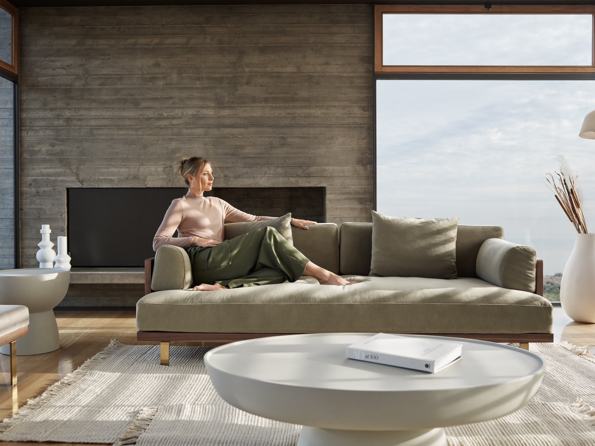 Првичната понуда вклучува комбинација на мултифункционални работи – длабок тросед, тапацирана клупа, ткаенини во маслинова боја, странични маси, минималистичка ламба и еднобоен тепих.