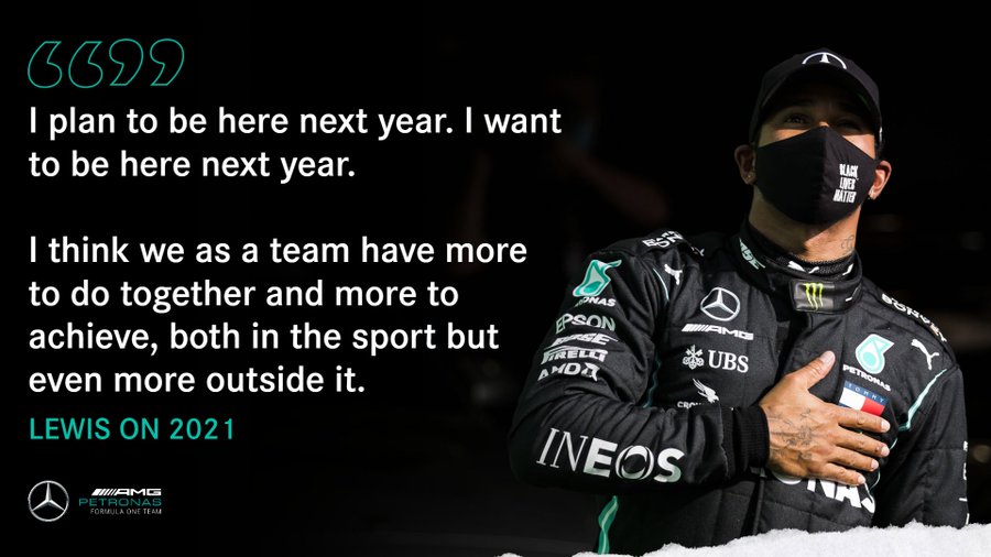 Преку официјалниот Твитер на тимот, Мерцедес објави цитат од Хамилтон дека сака да продолжи да се натпреварува за „Сребрените стрели“. Објавувањето е придружено со емотикони во форма на рака, потпишувајќи нешто со пенкало и со натпис „наскоро“.