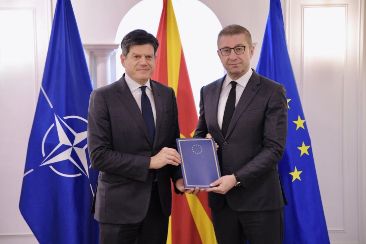Владата останува 100 проценти усогласена со заедничката надворешна и безбедносна политика на Европската унија, што претставува важна придобивка за карактерот на нашите меѓусебни односи и за нивото на нашата посветеност кон европските вредности. Како Влада остануваме целосно посветени на европскиот пат и на реформите кои ја прават државата посилна, пофункционална и поправедна. Ќе ги адресираме сите области каде е забележан застој со конкретни мерки и отчетност. Нашата цел е полноправно членство во рамки на ЕУ, порача премиерот Христијан Мицкоски на заедничката прес-конференција со ЕУ амбасадорот Михалис Рокас по примопредавањето на Извештајот за напредокот на земјава.