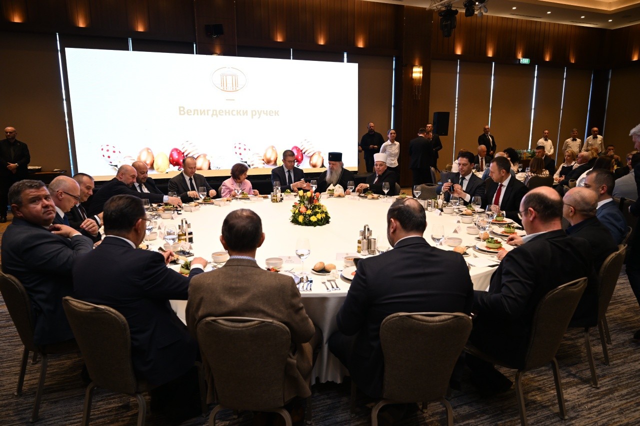 Премиерот Христијан Мицкоски вчера во еден скопски хотел приреди ручек по повод претстојниот верски празник Велигден, на кој, меѓу другите, присуствуваа претседателката на државата Гордана Сиљановска-Давкова , поглаварот на Македонската православна црква-Охридска архиепископија (МПЦ-ОА), г.г. Стефан, поглаварот на Исламската верска заедница (ИВЗ), Шаќир Фетаи, министри во Владата, пратеници, градоначалници и претставници на медиумите.