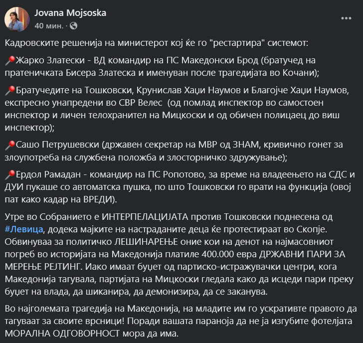 Утре во Собранието е ИНТЕРПЕЛАЦИЈАТА против Тошковски поднесена од Левица, додека мајките на настраданите деца ќе протестираат во Скопје. Обвинуваа за политичко ЛЕШИНАРЕЊЕ оние кои на денот на најмасовниот погреб во историјата на Македонија платиле 400.000 евра ДРЖАВНИ ПАРИ ЗА МЕРЕЊЕ РЕЈТИНГ. Иако имаат буџет од партиско-истражувачки центри, кога Македонија тагувала, партијата на Мицкоски гледала како да исцеди пари преку буџет на влада, да шиканира, да демонизира, да се заканува.