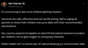 „Вакцините се безбедни, ефикасни и можат да спасат животи. Ги повикуваме сите родители да проверат дали нивните деца ги примиле сите препорачани вакцини“, напиша Стармер на Х.