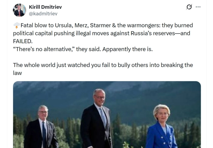 Дмитриев на Х напиша дека Фон дер Лајен, Мерц и Стармер не успеале, пренесе ДПА.