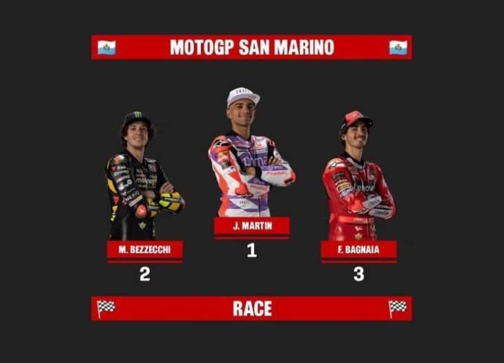 Шпанецот Хорхе Мартин (Дукати – Прамак) е победник на денешната Голема награда на Сан Марино, 12. од 20-те овосезонски трки во МотоГП.