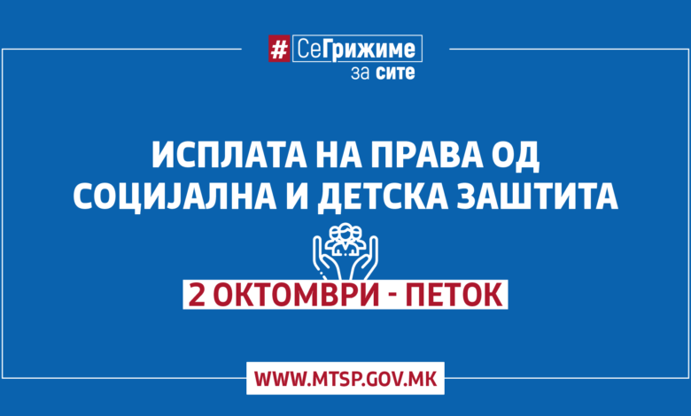 Министерството за труд и социјална политика информира дека од денеска започнува исплатата на правата од социјална и детска заштита за месец септември 2020 година.