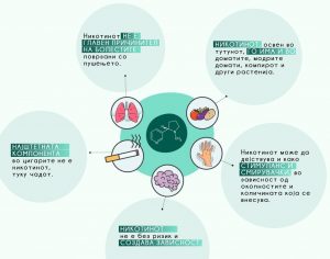 - Никотинот не е примарен причинител за болести поврзани со пушењето. Ова недвосмислено го потврдуваат голем број научни истражувања. Токсините и канцерогените материи кои се создаваат во чадот од тутун, при согорувањето, а не никотинот, предизвикуваат болести за кои главен причинител се смета пушењето.