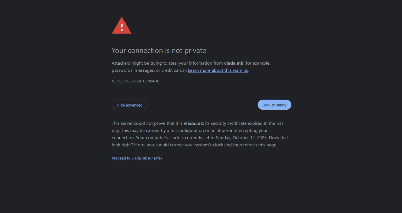 Официјалната веб-страница на Владата на Република Северна Македонија, vlada.mk, денеска е недостапна или означена како небезбедна за голем број корисници, поради тоа што нејзиниот безбедносен SSL сертификат е истечен. Овој основен пропуст во дигиталното одржување значи дека врската кон владината страница не е шифрирана и безбедна, што претставува сериозен безбедносен ризик, објави 4NEWS.mk