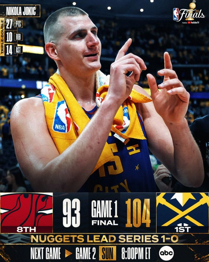 Јокиќ го заврши натпреварот со 27 поени, 10 скокови и 14 асистенции и беше клучен играч во составот на Денвер кој поведе со 1-0 во финалната серија до четири победи.