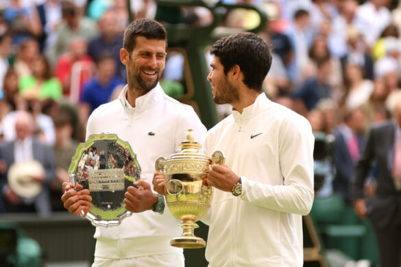 LONDON, ENGLAND – JULY 16: Novak Djokovic of Serbia (L) with the Men’s Singles Runner’s Up Plate alongside Carlos Alcaraz of Spain (R) and the Men’s Singles Trophy following the Men’s Singles Final on day fourteen of The Championships Wimbledon 2023 at All England Lawn Tennis and Croquet Club on July 16, 2023 in London, England. (Photo by Clive Brunskill/Getty Images)