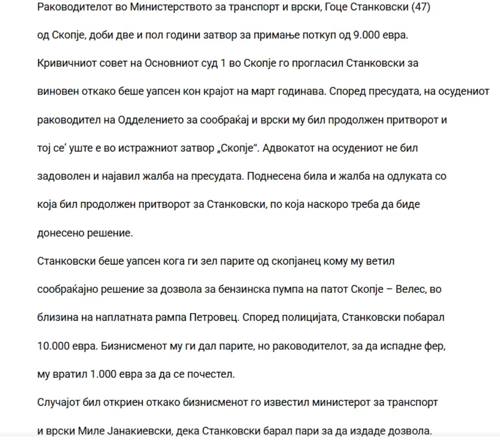 „Во 2009 година Станковски за поткуп од 9.000 евра доби две и пол години затвор. Министер тогаш беше Миле Јанакиески, а Станковски му ветил на Скопјанец сообраќајно решение за дозвола на бензинска пумпа на патот Скопје – Велес“, посочуваат од партијата.