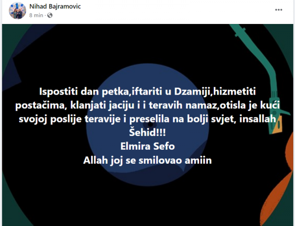 – „Да се пости во петок, ифтар во џамија, да се пости со постите, да се моли Таа по таравијата отиде дома и се пресели во подобар свет, иншалалах маченик. Аллах да ја смилува, амин “, се вели во соопштението